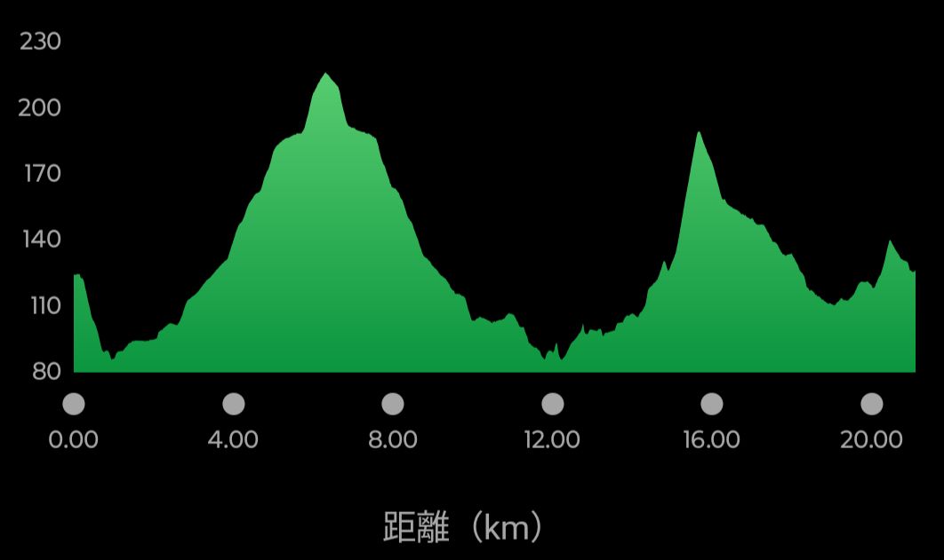 スタート前に横で話していた方の説明では「折り返しまでだらだらとした登坂」とのことだったけど、自分の力量では「だらだら」と言うには厳しく感じる勾配で所々で急登だし。坂を上りきってからは下り基調で、田園の中の狭い道で、曲がり角では気を遣いました。