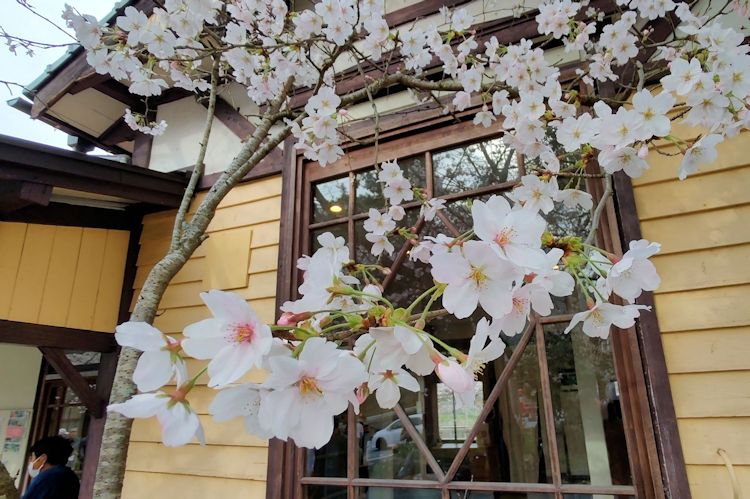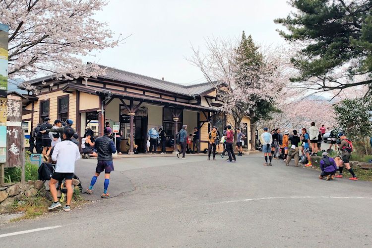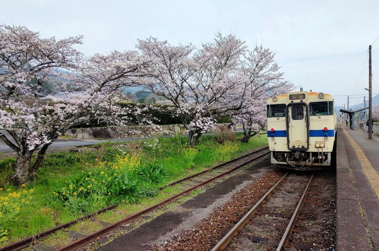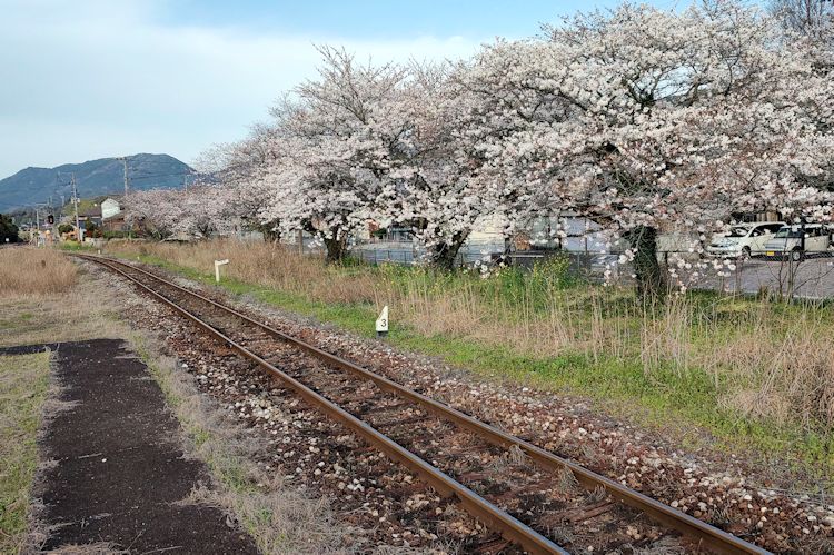 本番の翌日は朝早いので、1時間ちょいで駅に到着し準備万端で10分もかからず採銅所駅に到着すると、桜に囲まれたホーム周辺には撮り鉄の方々がスタンバイ。よく見るとトンネルの上も撮影スポットだし。