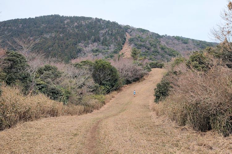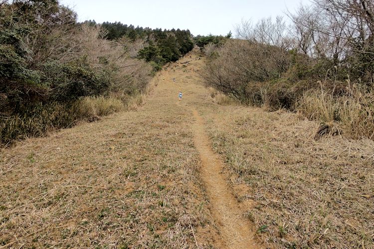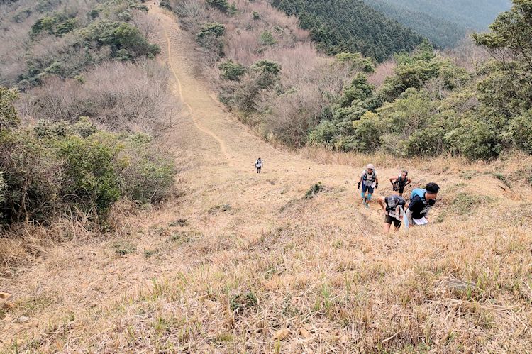スタート時刻は9:30。駅から歩いてスタート地点となる登山口に移動、ここで受付して待機。天気は曇りではないけど晴れでもない微妙な空模様だけど雨の心配はない。スタートすると稜線に出るまで登山道。稜線に出ると防火帯で草原状の気持ち良いトレイルです。今日は背後から迫る日差しが蒸し暑く福智山までこんな登山道が続きます。