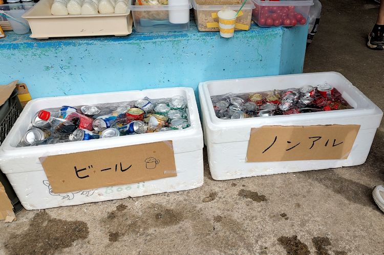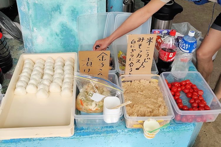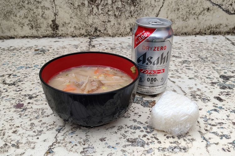 振り向くと振舞いコーナーには今まで見たこと無い「ビール」の看板。当然の「ノンアル」もあります。他には豚汁、おにぎり、トマト。豚汁の味噌は山岳会の手作りだそう。お椀の大きさも「丼」で無事完食できました。
