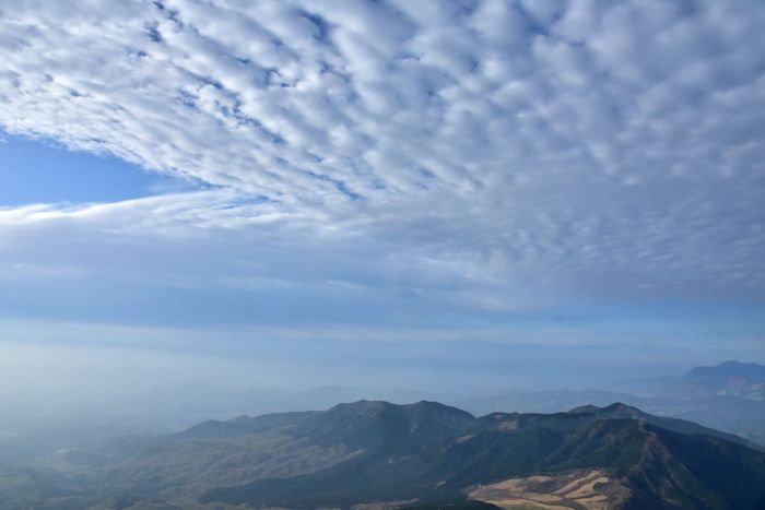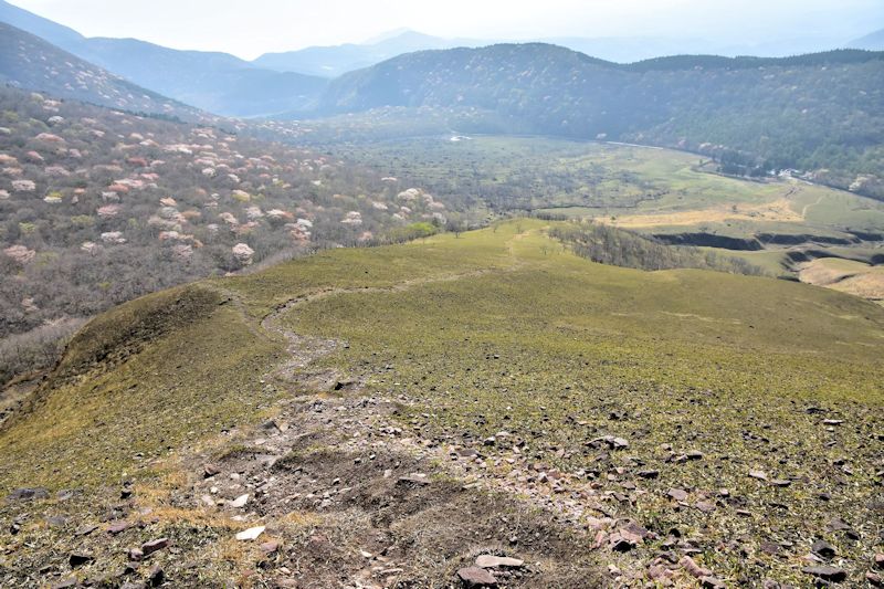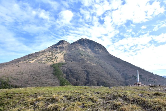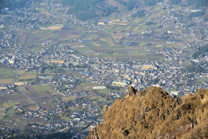 今日は嫁さんを連れてきたけど山頂はイマイチの天気だったのでハズレだったかな、と感じてたところ。飯盛の山頂て手前で振り返ると、由布岳山麓の山桜が見事!