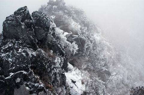 西峰山頂に日の出前に到着しましたが、風は強く、寒くて、少し時間稼ぎに風をよけながらココアを飲んでましたが、晴れないのでお鉢をまわることにしました。踏み出したとたん、今までとはうってかわって雪があり樹氷ありで全くの別世界です。途中、氷のような雪がぱらつきはじめました。ちょっと立ち止まってアイゼンを着けている間にもリュックの上に雪が積もりました。後で解ったのですが、安心院あたりでは道が白くなる位に雪が降ったそうです。