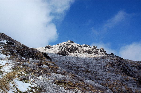 | さて、明日はどこに登ろうかと考え始めなかなか考えがまとまらず、何かテーマを、としばし考えそういえば冬の三俣山を登ったことがなかった! ということに気が付き三俣山を目指しました。最初、長者原からと思いましたが、この時間(5時20分頃)なら、ひょっとしてすがもり越えを過ぎたあたりで朝日を拝めるかもしれないと、大曲から登ることにしました。 道路は一部凍結している場所がありましたが、通行に影響するような箇所はありません。長者原、大曲、牧の戸の駐車場内の雪はほとんどありませんでした。(ただ、この時期は一日で状況は変わるので、気象、道路情報は最新のものを入手して準備、お出かけしてください) ここからヘッドランプを付けて登るのは、初めてでしたが思った程雪も無く、まだ暗いうちにすがもり越えに着きました。しかし、見渡すとガス、すがもりから上はガスがかかり、しかも風が強くなりました。ちなみに、登りはすがもりを過ぎて、しばらく上まではアイゼンは不要でした。 最初のピークに着いた時の風は強烈で一度、風を避けることが出来る場所に一時退散し、フリースを間に着て仕切り直しです。山頂のケルンには今年最大のエビのしっぽができていました。強風には当然雪の粒も含まれていてアウターのフードに音を立てながら当たります。視界も20〜50m程度。さすがに誰も登ってきません。普通はあまり聞きませんが、ちょっと休憩しながらラジオで朝ドラ「風のハルカ」を聞いたりしました。 登山道全般はこれまでに降った雪は凍っていて、アイスバーン状態、雪がないところは霜柱が4〜5段重なって10cm以上に成長していました。本峰、南峰を歩き、各ピークの鞍部はやや吹きだまり状態で新雪が15〜20cm程度の場所もありましたが歩きには影響ありません。ピークの看板には立派なエビが何十匹も着いておりました。エビのしっぽも当然の事ながら、樹氷の出来も今冬では最高の出来でした。青空をバックにと思い南峰のピークで風を避けて11時過ぎまで頑張っていましたが、とうとうここでは青空を見上げることが出来ませんでした。 南峰を下り始めてしばらくして、ようやく青空が見えましたが、わずかな時間でした。 |