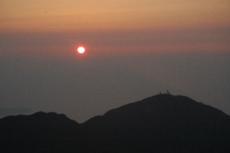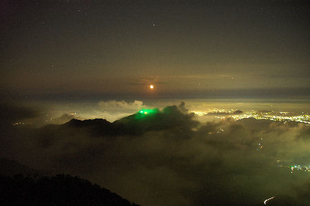 | 先週、早朝に登って感じたこと。 由布岳山頂から別府湾に登る朝日を見たい、それならついでに別府湾から登る月の出を見たい、それならついでに落陽を見たい。となれば手っ取り早いのは由布岳山頂で一晩を過ごすのが一番合理的!ということで、一晩を由布岳山頂で過ごしてみました。 今回は楽チン登山を念頭に、夕方5時頃から登り始め東峰途中で西峰側、障子戸横に沈む夕日を眺めました。 とは言え、この時間はまだ気温も高く、先週より荷物が重い(ビールと焼酎とつまみのせい・・・かも)ので少し時間がかかったのと翌日に疲れが予想以上に残りました。 宿泊場所は東峰から少し下がった場所のテラスにしました(ここしか無い・・・)しばらくすると真っ暗になり、空を見上げると満天の星ですが今日は少し、ガスがかかっているような感じで、すこーし星の輝きに切れがありません。 下界に目をやると大分市方面の夜景、湯布院の街明かり、真下には城島後楽園の明かりがあり「真っ暗」とは言えない状態です。月の出は9時20分過ぎで真っ赤な月が別府湾方面から上がってきました。しばらくすると月明かりも本格的になり、夜空の星が少なくなりました。時折、鶴見岳方面からガスがかかったりと、これはこれで幻想的な景色です。 湯布院方面に目をやれば、湯布院の街明かりを背景に由布岳の岩場のシルエットが見えるなど十分夜景をの楽しめます。 翌朝は朝日を見に山頂に立ちましたが、少しもやがかかった感じで、真っ赤な朝日が昇ってきました。 ご来光を眺めた後は、特にお鉢周りをすることも無く、速攻下りました。ただし、飯盛ヶ城経由です。 先週に続き、いろんな花が咲き始めノリウツギ、シモツケ、アジサイ、ギボウシ、ホタルブクロ、オトギリソウ、ツクシフウロ、ホソバノヤマハハコ、カワラナデシコ、サイヨウシャジン、シュロソウ等々が見ることが出来ました。飯盛ヶ城へ向かったのはヒゴダイ鑑賞のためで、ちょうど今が旬といったところでお勧めスポットです。 |
