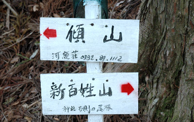 (5) 大明神に安全祈願して出発です。宮崎県側から登ると右の看板の「新百姓山」方向に進みます。(6)の看板から見えます。 |
