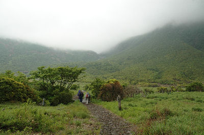 P坊がつる。前に見える三俣山はすっかりガスがかかっています。 |