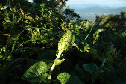 | ここのところ、一日に登る標高差が600〜800m程度だったこともあり久々に由布岳お鉢回り&飯盛ヶ城散策&ご来光を眺めることにしました。 正面登山口には3時過ぎに到着し、満天の星を見上げながら3時30分頃から歩き始めました。今回は荷物も普通なので2時間もあれば山頂到着、ご来光を拝める計算です。問題は、西峰か東峰からということです。事前にカシミールでシミュレートしておけばよかったのですが、日頃は西峰から夜明けをみることが多いので、今回は東峰山頂からご来光を拝むこととしました。 山頂には周囲もすっかり明るくなった5時15分過ぎに到着しました。空の明るさから見るとどうやら別府湾あたりから陽が昇りそうです。三脚にカメラをセットして涼みながらのんびりと日の出を待ちながら、ビールで祝杯です。日の出の方向を良く見ていると、星が輝いていており、どうやら水星のようです。でもって、その上には金星が輝いていていて、ちょっと得した気分になりました。 赤い太陽が雲の中から昇ってきて、そのうち真っ赤になり、しばらくすると普通の太陽の色で輝き始めました。早朝とはいえやはり陽にあたると暑く感じます。準備をしてお鉢回りに出発です。途中で、オオヤマレンゲの実を観察し、久々の岩場のとっかかりで岩から手がすっぽ抜けて見事に転び岩の間にすっぽりはまり、左腕に打撲&傷の負傷でした(ちょっとやばかったかも・・・)。次第に、西峰方面に足を進めていくとイヨフウロが多く咲いています。大崩の立ち入り禁止看板を過ぎるとオタカラコウ、トリカブト、マルバテンニンソウ等はまだ蕾ですが、それなりに鑑賞の対象として十分です。 西峰に着くと先客がいて、そのあとすぐに若い方が2名登ってこられました。マタエを覗くと1名が休憩中でそろそろ登り始めてきています。とにかく暑くなる前にと思い8時前には下山を開始です。このあと上から見下ろし飯盛ヶ城に寄るべきかどうか・・・とにかく日除けがないし暑そうだし・・・と考えながら、合野越を通過するとき自然と飯盛ヶ城方面に足が向いていました。目的はヒゴタイです。既に咲き始めているようですが、少し個体数としては少ないようなので今からなのかもしれません。 飯盛ヶ城山頂でしばし由布岳を見上げた後、一気に下り9時20分頃に正面登山口に到着しました。振り向くと緑の草原と青い空が眩しい由布岳でした。 |