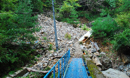 カンカケ谷。良く見ると赤テープを巻いた石が置かれています。 |