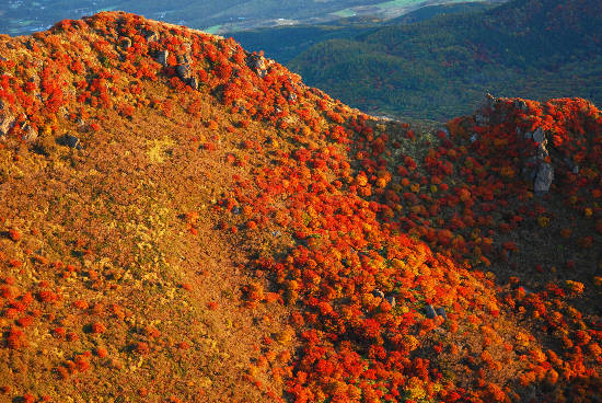 南峰に向かう途中からの振り返ると 紅葉と月 |