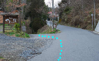 ![]() (4) 地点2 登山口となる場所。目の前が一目山で点線方向に舗装道路を歩いていきます。 |