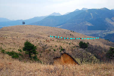 ![]() (8) 地点3=一目山山頂より 山頂より登山口方面を眺めたところ。点線が歩いた跡です。 白いのは八丁原地熱発電所の水蒸気です。 |