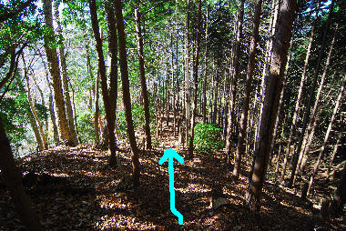 ![]() (24) 下山開始すると間もなくして杉林の中の下りになります。 ※ここから先の写真の矢印は下山方向です。 |