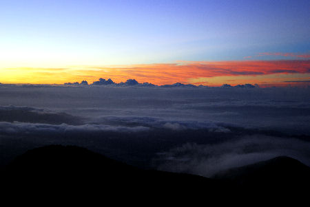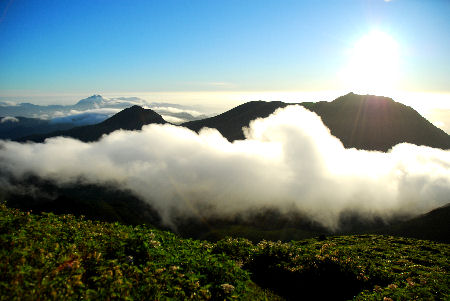 | 7月は天候不良に加えて、転倒、尿酸値上昇によりさんざんな山登りライフでした。8月に入っても天候はすぐれずなかなか頭に描いたような山行ができない日々・・・うーん、このフラストレーション、この際天候に左右されない趣味に変更するかぁ、と少々やけっぱちな気持ち。なにやら勝てなくなった球団のファンもこんな状態で結局何かにつけて酒屋で一杯なんでしょうね〜 今週もなにやら怪しい天気予報。 当初は日曜日に登る予定にしていましたが土曜日に前倒しして登ることにしました。せっかくなので、気合いを入れて朝駆け。カシミールで中岳か白口岳山頂だと大船山山頂付近の日の出を確認し、中岳を目指して大曲を3時過ぎに出発です。 大曲に着き空を見上げると満月が皓々と輝き、雲はほとんど見えず、日の出は単調な景色かなぁ、と想像しながら歩き始めました。さすがに満月、ヘッドランプはほとんど不要です。すがもり越えに着くと正面に大船山の上にオリオン座が登り始めています。これが、新月だと本当に星降る空だったのにと贅沢な我が儘を抱きながら久住分かれへと足を進めます。暗いときに北千里など歩いたことが無かったこともありますが、あまりに広いのも案外不安に感じるものでした。 久住分かれを過ぎしばらくして後ろを振り向くと、同じようにヘッドランプを点けてこちらに歩いてくる方がいました。御池の脇を歩き、中岳が目の前に見えると地平線が明るくなりかけた山頂のシルエットにはどうやら2〜3人ほど先客がいらっしゃるようです。山頂には5時過ぎに到着、日の出にはあと30分ほどありますが久住山、天狗が城などもうっすら明るくなりかけています。東の空には雲の波が久住方面に押し寄せています。祖母傾はすでに飲み込まれて稜線だけが出ている状態です。また、由布岳は刻々と雲が山頂から山麓にかけて巻き上げていきます。目の前では白口岳が雲に覆われたり、大船山と白口岳の合間からガスが流れ込み、それは次第に大船山を飲み込んでは山頂が時折頭を覗かせますが、最後はすっかりガスに覆われてしまいました。 途中で、稲星山に移動しましたが、そこも同様で稲星山自体がついにガスに覆われ、しばし、うとうとしながらガスが晴れるのを待ちますが青空が部分的に覗いては、あっという間に隠れてしまいます。ここは、諦め恐らく風向きからするとひょっとしたら星生山方面は晴れているかも〜、と。それに星生山池塘もちょっと気になり立ち寄ることにしました。そこには、ワレモコウ、ギボウシ、ママコナなどがちょうど見頃を迎えていました。ここから、星生山に登っていくとフクオウソウも点在、まだ開花していませんでしたが開花は間もなくです。 星生山山頂まで足を運んだあと星生新道を下っている時でした。このルートにしては珍しくすれ違う登山者が多いなぁ、と思っていると、岩場付近で二人連れが登ってきます。すれ違うために脇道に逸れようとした時、登ってくる方が顔を上げた瞬間、「あっ!」なんと「hirokoさん」でした。1年に数回、遭遇&ニアミス、いつもは単独ですが、本日はご主人と二人連れでした。ご主人の話は「hirokoさん」のHPや本人から伺っていましたがお会いするのは初めてで、逆も然り。そこは、ネットの威力、初めてお会いしたような気がしないのが不思議なところです。しばし、お初のご挨拶と山の話やら短い時間でしたが、初めてとは思えないご主人も含め歓談の一時でした。 何はともあれ、早朝から綺麗な自然の造形美を眺め、抜けるような透明感の高い青い空を見上げる事ができました。 ついでではありますが、当日から全国高校野球が開催、初日から大分代表が出場し、なんとさよなら勝ちで初戦を突破しました。さらについでですが、大分代表、明豊高校の校歌は南こうせつの作曲で、他校の校歌に比べるとなんとも爽やか、今風で、歌詞を含めて琴線に触れるものがあります。もしよろしければ、大分代表の対戦を。 |