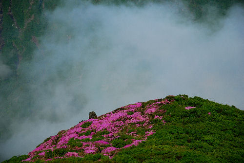 | 先週末土曜日(6月12日)に引き続き4回目の開花調査です。 今回はさすがに週のど真ん中なので峰入りは一旦さておき、先日、長崎隊と歩いたときに水曜日ぐらいが見頃かなぁ、と予想したところですが、偶然(なかば強制的に仕事を排除・・・)仕事が無かったので、久々に休みを頂き、そそくさと出掛けました。前日にはそよかぜ姉さんからもメールが入り、こちらに来るとのこと。 今回は長崎隊とは合流せず、それぞれで登りましたが、こちら地元民の方が当然ながら早く山に入れるので、山頂から山の情報を入れたところです。平治岳山頂には6時30過ぎに到着しましたが、周囲を見ると雲海状態で、由布岳も耳の先っぽしか見えない状態で、どうかすると平治岳もガスに覆われる状況でした。そよかぜ姉さんに電話すると下界は曇り状態だったらしく、「山の上はピーカンだぜ!」と。でも、平治の尾から登るとズルズルで滑る事を伝えるのを忘れておりました。ごめん。 肝心のミヤマキリシマはというと、平治岳山頂、北大船山付近はまさに見頃かと思いました。平治岳本峰では三俣山方面を散歩しましたがまさにミヤマキリシマの絨毯、私見ではありますがまさに絶頂期かと。そのあと、大船山頂に向かいましたが、北大船山周辺も開花が一気に進み見頃のように感じました。 ということで、平治岳山頂周辺に1時間半、北大船から大船山まであちこち立ち止まり、大船山頂で濡れた足を干してゆっくり休憩しながら、ミヤマキリシマと沸き上がるガスを堪能したしだいです。見ての通り景色は夏模様でした。 【今回のコース】 吉部駐車場(4:15スタート)−(平治の尾経由)−平治岳−(大戸越)−北大船−大船山−坊がつる−吉部登山口(14:40) 【開花状況等】 @平治岳は山頂付近は見頃、大戸越近くでは花が枯れ始めています。 A北大船山山頂前後も見頃(7分咲程度) 6月12日は2〜3分咲 B大戸越から北大船山の尾根に上がり着いた辺りは3〜5分咲 ※大船山側が5〜7分、三俣山側が3分程度と斜面によってやや咲き具合が異なります。 C大船山頂周辺は2〜3分咲、 D大船山頂からですが、白口岳、稲星山周辺はピンク色がチラホラ、中岳はあまり見えませんでした。 E虫の被害は殆ど観察されませんでした。 F大戸越付近ではオオヤマレンゲの蕾が白くなっていました。間もなく咲きそうでした ※あくまでも私感なので、登ってみて違うじゃん、と思っても責めないで下さい。 (2010.6.16) |