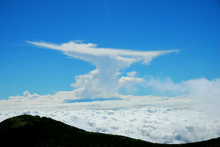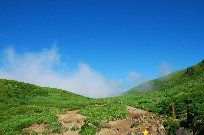 | まずまずの天気が予想された3連休。当初の予定は1泊2日で祖母山系テント泊山行の予定でしたが、諸般の事情&宮崎県北部山添いの天気が今イチとの予想もあり、見送ることに・・・でもって、中日に朝駆けしようと思っていたら気が付くと、とても夜明けに間に合う時間ではなく自分の不甲斐なさに呆れてふて寝。これじゃいかんと思いとっても暑い中、ジョグをしたらしっかり短パンの下が日焼けで真っ赤になりました。 3日目、さすがにこりゃいかん、となんとか1時頃に起き出して大曲に向けて出発です。 今回は先週購入した新しい靴の試しもあります。これまで、sirio、mont-bell、Lowa、Akuと4社目、正確にいうと5社目ですが、最初の1足は普通の靴屋さんで購入、30山目を過ぎたあたりからつま先あたりからボロボロになってしまいました。 最初に足を入れて、足に馴染むまでの早さをいうとLowa、Aku、mont-bell、sirioの順でした。当然、個人の足形があるのでそれぞれ印象は違うと思いますが、sirioに関して初めて本格的な登山靴を購入するので店員さんと相談、足の形を見てもらっての購入だったので、足が慣れるまで時間がかかるんだ〜、と勝手に納得していましたが、それはどうやら間違いだったようで・・・ 今回のAkuは右足のかかとにマメができたくらいで、自分としてはまずまずではなかったかと感じております。 日の出に間に合わせたいと、3時に大曲を出発、すがもり越から先はそれなりに頑張りましたが、中岳まで行くとちと厳しそうだったので天狗が城で日の出を拝むことにしました。普段は結構人が居るのですが、今日に限って自分だけと贅沢な空間となりました。山頂からの景色は雲海に覆われ、由布岳も双耳が見える程度で殆どの山が雲海に溺れておりました。普通は、最初の山でまずあり得ないのですが、コーヒーを入れてついついのんびりしてしまいました。 その後中岳、稲星山、久住分れを経由して星生山下の池塘に立ち寄り、その後星生山の山頂を踏んで星生新道を下りました。本日は東側は雲海に溺れつつも空気の透明度が高く、祖母山系、長崎方面や英彦山系やその向こうの山も良く見えておりました。とは言え、大気の状態が不安定との予報もあり、特に宮崎県方面は入道雲のような雲が朝からモクモクと盛り上がっておりました。 久住分れ付近に着いた9:00頃には谷間からガスが登ってきて、久住山を隠すように覆っていくなど、景色はまさに夏突入といった印象です。星生山にも扇が鼻と肥前ヶ城との谷間から登ってきたガスが時折山々を隠し始めました。 とはいえ、今回歩いた範囲では花はちょうど端境期といった印象で、ノリウツギが咲き始め、途中、立ち寄った池塘ではギボウシが、その他フクオウソウなどの蕾がチラホラといった感じです。中岳山頂から見えた坊がつるにはテントが40張りほど、昨晩はさぞ賑やかだったかなぁ、などと羨ましい気持ちを抱きながら12時前に下山終了です。 (2010.7.19) |