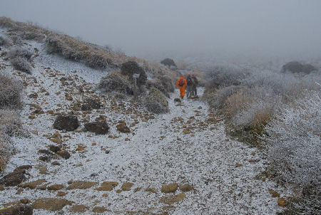 | 寒波の到来と休日が合わなかったり所用のせいで雪山に登ることが出来なかったのですが、ようやく今回の寒波と土日が良い感じで重なり、止めとけばいいのに一か八かで中岳に朝駆けすることにしました。夜中は雪らしい雪は全くなく、牧の戸まで全く問題なく到着、空を見上げるとガスの流れは早いものの、星や月が見え、まぁ、雪景色は望めないにしても日の出を期待できる空模様、朝駆けの甲斐ががあったかなぁ〜、夜空を眺めておりました。それにしても寒いのです・・・ 地面はガチガチに凍り付き、霜柱が持ち上がっていますが雪は殆どありません。が、次第にガスが濃くなりつつあるものの久住別れの避難小屋に着いた頃には時折、月光に照らされた久住山も見えるなど感動して見上げておりましたが、これが本日最後の久住山の姿であることはこの時点で知る由もありません。写真を撮っておけば良かった・・・ 避難小屋に着いたのが6時前でかなり強風だったこともあり中岳山頂で頑張っても1時間が限度と思い避難小屋で30分ほど待機して出発です。 が、次第にガスが濃くなり御池付近からは突風に近い風に吹き飛ばされそうになりながら足を進め、御池の上を縦断するつもりがなんとまだ、氷結していません。中岳までは突風と格闘しながらなんとか中岳山頂についたものの、夜明けを過ぎても晴れることなく撃沈。気温−10℃。このままでは凍死しそうなので池の小屋に避難しましたが、ここに行くまでも風との格闘で一苦労でした。ストーブで暖を取りながら1時間ほど待機しましたが天候の回復は望めそうに無く強風の中とりあえず久住分かれまで歩き、ここで再び避難小屋で小休止。 池の小屋から久住分かの避難小屋までの間、こんな天候にもかかわらず2名の方とすれ違い、小屋でも数名、下山時には30名前後の方とすれ違いました。ペットボトルの中は凍り付き、ザックの中に入れていた巻きずしもフリーズし口にした時は絶妙なシャキシャキ感、暖かい部屋なら「新食感!」なんて言えるかもしれませんが、この寒さの中では洒落にもなりませんでした。 星生崎を過ぎた辺りから、どうやら雪が降り始めたらしく、登るときは土が見えていた登山道も白くなっていました。沓掛山を過ぎたところで、駐車場を見ると車の影に雪が吹きだまり、走っている車の音もなにやらチェーンぽい音がしています。牧の戸峠付近はそれほどではありませんでしたが、水分峠までほぼ全線真っ白で、2台ほど落ちたり、ぶつけたりと生々しい現場を見かけてしまいました。 久々の寒さの中、バラクラバが薄く顔が寒かったこと、ストーブのガス、荷物の出し入れの簡略化など課題もありましたが、やっぱり何度か寒い目に遭わないと解りません。しかし、良く考えると装備以前に撤退の判断も必要だったかもしれません。今回の寒さ+強風のコンディションはあまり記憶に無く良い経験になりました。 (2010.12.25) |