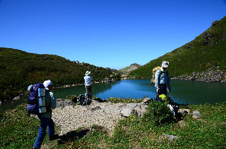 | 「坊がつるで良い酔いの夜を楽しもう!」メールがそよかぜ姉さんから届き、本来であれば先週実行するはずでしたが台風の影響で、こりゃ、無理でしょ、ということで今週に延期となりました。メンバーは当初より若干減り、そよかぜ姉さん、山馬鹿さん、hirokoさん夫妻、と自分の5名でのツアーとなりました。特に、hirokoさん夫妻はテント泊デビューでその結果はいかに〜 まずは長者原に集合、バスで牧の戸まで移動してから歩くことに。それまで少し時間があったので本日の荷物の確認をしていて、山馬鹿さんにワインをどうしたか聞くとペットボトルに移し替えたとのこと、それならと自分も500mlのペットボトルへ。そーすると瓶に若干あまりが・・・捨てるのはもったいないし、なら飲もう!ということになり朝っぱらからバス停でワインで乾杯・・・大丈夫かな〜 牧の戸に降り立つと、見たことも無い様な喧騒ぶりです。時間帯もさることながら先週の連休で登れなかった鬱憤ばらしと言ったところでしょうか。それを証明するかの様に坊がつるのテントはなんと100張りを越え、hirokoパパによれば約140張りあったそうです。とにかく、人混みに紛れて怪しい5人集団も出発です。とにかく人人、そして人。牧の戸から久住分かれまではしょうがないなぁ、と諦めつつも最近は若い方も多くその点は目の保養になって良いかなぁ〜 ふと、気が付くと愛犬を連れた「なおさん」夫妻が歩いています。先日、中岳の山頂でお会いしていてザックは同じだし、愛犬も同行、ブログで見慣れたご主人の後ろ姿だったので声を掛け正式にご対面いたしました。その後、銀座通りから外れ池塘で休憩し星生山、星生崎を経由して御池で昼食にしました。池塘ではほとんどの花が終了しヤマラッキョが咲き始めていました。 御池のほとりで中岳を見上げると大層な人出、結局、ここもほぼ通過点に近い足取りで白口谷へ。ここも相変わらず難儀なルートで、テント泊の荷物のため少しふらふらするとすぐ倒れそうになるくらい石がゴロゴロ、迂回路は川の中だし「もう、嫌だ〜」と声をあげながら下っていきました。 ようやく、法華院温泉に着くと山馬鹿さんが早速ビールで乾杯の音頭、一息ついてから坊がつるのテント村に向かいました。すでに、多くのテントがひしめき合い、思い思いに山を満喫しているようです。おっさんたちもそそくさとテントを設営し宴会モードです。時間はまだ16時前。どこからともなく出てくるつまみに舌鼓を打ちながら朝方味見をしたワインを飲んでいると、「今からそんなに飲んだらおでんが食べきれん!」との声に応え「おでんをつまみに飲んで、ごはんは梅干しとたくあんがあれば食える!?」と16時の時点でおでんパーティと相成り、16時30過ぎにはほぼ食べ尽くしてしまい、時間感覚が完全にマヒした状態です。 その後、山馬鹿先生によるごはん炊き教室で生徒はhirokoパパ。しかし、先生はすでにろれつのまわらない状態で生徒も少し頑固者で横で見ていると禅問答しているようで本当にごはんは無事炊けるのか心配でしたが、なんとかお焦げも最小限に先生、生徒ともに炊きあがりました。こうして、ごはんと漬け物を食べた後は寝るのみ!!なんとテント入って寝たのは19時にもならない時間、周囲のテントでは今から食事の準備や食事に取りかかっている時刻、初日の「夜」は更けゆくのでした。 後半に続く〜 (2011.9.23) |