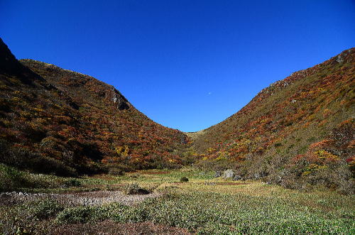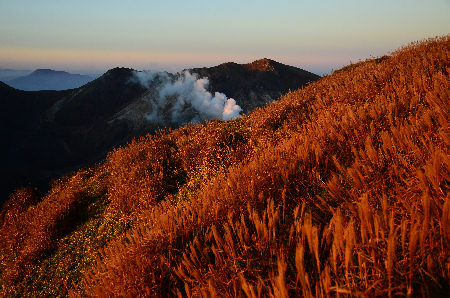 | 天気予報とスケジュールと突き合わせているとこの日しかない、と判断し恒例の紅葉三昧デーを設定しました。 15日に大船山に登りなんだかイマイチかな〜、と思いながら、翌日晴天の中登ったそよかぜ姉さんから「紅が足りん!!」とのメール。14日の雨でかなり落葉したのが影響しているようです。そう言われて改めてモザイクの様に紅葉する岩場を見ると今年はすでに7〜8割ほど落葉し色気のない状態です。 それでも、諦めの悪い自分としては自分で再度、天気の良い日に確認せねば、と出かけた次第です。夜明け前から日が沈むまでのレポです。 いつものように大曲に駐車し三俣山を目指します。天気予報は晴れですがなんとも空を見上げると怪しい雲行き。どのくらい日頃の行いが悪いのか・・・と思いたくなるくらいです。すがもりから西峰を登っていくとしっかりガスに巻かれありゃ〜、と思いながら合羽を履きこれで露も大丈夫、と思っていると南峰に近付くとガスは取れ、露も無くなり雲海の上に出た様な感じで、思わず「お〜っ」。南峰に到着した頃にはほとんどガスも無くなり静かな日の出となりました。 夜が明けてから大鍋の様子を眺めに行きましたが、やはり落葉に加えなんとなく色が冴えません。それでも大船山より良いかな〜、と。時間もあるので久々鍋底に降り下から眺めてみましたが印象は同じです。その後小鍋の縁に立ち寄りましたが、少しピークを過ぎた感じです。 南峰に戻り坊がつるに急降下し立中山経由で大船山を目指し、途中鉢窪に立ち寄り大船山を見上げましたが、例年のような紅い紅葉が少なくすでに灰色が目立つ斜面となっていました。 ということで、今年の紅葉のピークは絶頂期を迎えずに終了した感があります。今週の天気予報は金、土が雨マークがあるのでこれを過ぎると、ちと厳しいかな〜、と感じました。途中、お話しした方によれば、黒岳の方が少し遅いので、とのことだったし確かに天狗岩の下辺りはかなり紅くなっていたので良いのかもしれません。 さて、大船山山頂に14時頃到着しましたが、段原方面の色も冴えず、御池の周辺も15日より色が褪めた印象です。こーなれば夕日に染まるのを待つのみで、16時頃まではココアを飲んだり、おやつを食べたり、寝たりと時間を有効活用し夕暮れに備えます。 忙しくなるのは16時30分過ぎてから1時間ほど。あっちこち動き回り写真を撮り、下山する支度をしてはまた写真を撮り、ザックを担いで下りながら撮影。さらに、星空を見上げてまた撮影。それでもなんとか大曲に20時頃到着、帰路につきました。 これで、本年のくじゅうの紅葉レポを終了致します。 (2011.10.18) 2010年の紅葉レポ 10月28日 10月18日 10月10日 2009年の紅葉レポ 10月21日 10月18日 10月14日 10月10日 ※それ以前紅葉時期のレポ (2008.11.18、2007.10.28、2007.10.30、2006.10.28、2005.11.2大船のみ) |