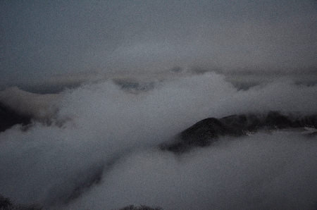 | 新年最初の3連休ですが諸般の事情で1日のみの山行、当初は祖母山と決めていましたが、これまた追加の事情で少し近いくじゅう辺りに登ることにしました。ここのところ腰をいたわって荷物も軽くしていますがたまには20kgは担いでおかないと、とプラス年末に朝駆けしたとき天狗から大船山を注視していると、山頂だけはガスが懸かりにくい地形の様に感じました。そこで、大船山朝駆け&プチボッカのこころだ〜 でスタートです。 連休の間、今水からはそこそこに登ったと思われ、はじめのうち登山道は圧雪状態ですが早朝なのでガチガチに凍っていてアイゼンの必要はありません。しかし、東尾根ルートに入り次第に標高が高くなりポールのある見晴らしの良い地点を過ぎたあたりからどうしようかな〜、と思いつつなんとか凌ぎ結局山頂までアイゼン無しで登りましたが、途中で装着すべき状況でありました。雪の量は大したことはありませんが、山頂に近くなると雪山の雰囲気は楽しめるくらいの積雪量でした。 問題は空模様で途中からガスが・・・この時点でなかば諦めていましたがなにはともあれ山頂へ、ということでほとんど休憩もとらず、重い荷物にヒーコラ言いながら、なんとか夜明け前に山頂に到着です。当然ガスの中ですが一瞬山の影が見えました。どーやら、ガスが切れているようです。しばらくすると1名が登ってこられ「ガスですね〜」のあいさつ。それでも、ガスが切れる頻度も多くなりちょっとイケそう。すると今度は15名ほどの大集団が・・・で、どうーいうわけだか、夜明けの時間が過ぎるとさっさと下ってしまいもったいないな〜と。ただ、静かになりますが。 次第にガスが切れ、中岳、三俣方面も良く見える様になりましたが、青空が見えなかったのでしばらく御池に降りてお茶することにしました。改めて、思い起こすに凍った御池に降りたのは初めてだと。そー思うと感激もひとしおで、しかも青空も覗き始めしばらく御池の真ん中で白い樹氷と青い空を見上げておりました。 一旦、山頂に戻り青空が綺麗な写真を撮影後段原に向かい、そこから風穴方面に降りることにしました。こちらのルートはほとんど足跡が無く、1組の男女(靴のサイズで勝手に断定)が歩いたのみでほぼ新雪状態です。しかも深い所は30cmほどあり、もし登りで使っていたらそこそこに大変だったかも〜、と思いながら雪の感触を楽しみながら下りました。 朝イチは今日も撃沈かぁ、と日頃の行いを思わず振り返りそうになりましたが、まずまずの景色を堪能できた一日でした。 (2012.1.9) |