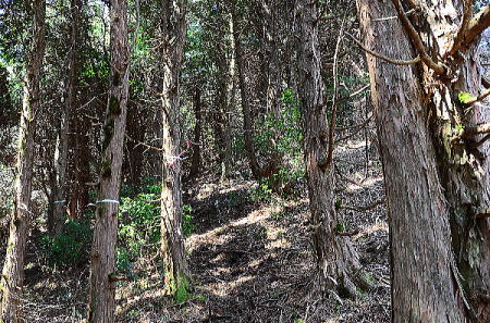 ![]() (25) 地図「16」地点を過ぎてヒノキ林の中を登っていきます。 |