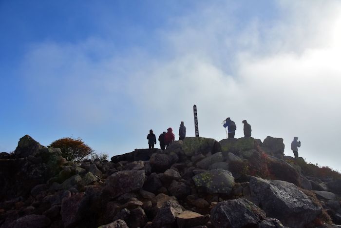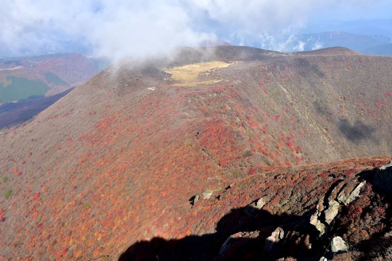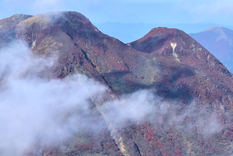 先週の3連休の1日は体力測定するつもりでしたが、飛び込みの用事や、やらなければならないこともあり登らずじまいでした。多分、この頃が紅葉のピークかな〜と思ってたけど、今週の土曜日の午前中はなんとかイケそう。 3連休明けのへーじつ山の日を企みましたが、高齢者あるある(-_-) 前立腺がんの検査結果の値が高いので再検査しろ、とのお達し。検査した病院からの検査結果の到着が早かったのもそのせい・・・ 看護師してる長女が休みだったので同行してくれました。泌尿器は全然知らないので向学のためとか。 診察室に入り医師の説明。 結果に関わらず昼飯は寿司の水天へ。医師の話を聞いてホッとしたこともあり、高い値段の方の皿から注文。 山頂に7時20分頃到着直前、急にガスが掛かってきて山頂はそのまましばらくガスに巻かれたまま。 諦めかけてたけどガスが何度も切れるうちにいつもの山頂の景色が戻ってきました。山頂周辺の紅葉はピークを過ぎてたけど段原方面、さらに三俣山などそれなりに綺麗な紅葉を堪能し下山しました。 下山途中、昨今のSNSのせいなのか普通登らないような方が登ってくる訳で。 さらに強者。下山した13時頃。日本語ではない方々が5,6人普通の恰好でで登りかけました。 他にも見ていた方が「ハイキング気分で大丈夫か〜」 一方で、若いソロの男性とスライドする際、声を掛けられて改めて改めて拝顔すると元職場の同僚でした。