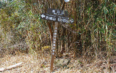 ![]() (11) 杉林の中を歩くと古城山へ左折する看板があり、きちんと整備されていませんが踏み跡は明瞭です。 |