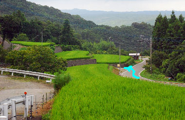 | @宇佐市から大分方面に向かい山香町立石で国道10号で竜ヶ尾へ左折。 A峠で右手にため池を見て、陽平の集落で左折、1.6km程で登山口となるコンクリ舗装の分岐に着きます。 |