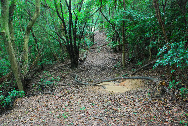 ![]() (7) 観音堂。中身は空でした。 このあたりから山頂に行けると考え、しばらく登山道を探してみましたが見つからず、「2.右へ」後戻りです |