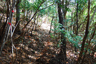 ![]() (6) 尾根付近は杉林と雑木林の境を歩きます。 |