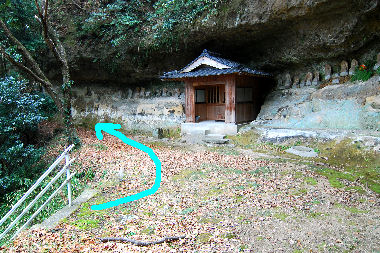 ![]() (3) 地図「2.石仏群」 階段を登り上がるとお堂と石仏があり、矢印の方向へ。 |