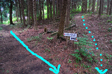 ![]() (5) 地図「3.分岐2」 ここで実線の道と合流しました。 看板を見ると明らかに実線の道に誘導しています。 |