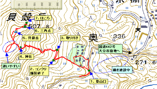 | 個人的な里山に対する感想。里山を登っていて三角点と個人の方が設置した看板がある山頂は当たり前の光景でむしろ三角点だけの方が感動したりします。それ以上に歴史的な遺構や昔の年号が刻まれた石碑などがあると、さらにその感動が大きいのです。貝殻岳はまさにそれに該当する山でした。午前中、大船山に登り帰宅途中で適当な時間で登ることが出来る山を、と選択した次第です。 最初は、看板があるくらいかなぁ、と想定していましたが、山頂手前に神社らしきものがあり、大岩をご神体にしているようで、この神社自体も手前の大岩で登ってきた道から直接見えません。さらに、三角点がある場所に行くと三角点に加え、なにやら祠のようなものが2基あります。一つは、なんと十字が刻まれており、どうみても「キリシタン」です。何か刻まれているかも、と祠のまわりを一周してみましたが、それらしいものは見当たりませんでした。 帰宅してインターネットで調べてみると、キリシタン大名だった大友宗麟の影響により大分から熊本までの肥後街道沿線を「キリシタンベルト」と呼んでいるようで、その視点で貝殻岳を見ると合点。そして、もう1基はお墓のようです。もっと周辺を調べると遺構らしいものがあるかもしれません。そんな訳で久々に里山で感動し、改めて里山藪こぎ登山はこれだから止められんなぁ、と再認識したところです。 前置きが長くなりました。大分市内からだと国道442号を野津原方面に進み、久住町方面へ行く県道412号の分岐点をそのまま国道442号を進みます。県道412号の分岐から5.2km付近の奥地区から登ります。最初は、登山口の看板を見つけたのでそちらから登りましたが、道沿いに水準点らしい施設がある場所から田んぼ沿いに登った方が分かりやすいように感じました。 田んぼ沿いに登っていくとコンクリート舗装の道が終わり、水路に突きあたります。右折、水路に沿って200m程歩くと水路を越える場所がありここから登っていきます。登山道は低山の割にはしっかりしている印象です。10分を過ぎると大きな岩が出てきます。やがて、大きい岩を左から回り込むと階段があり大きな岩の下に神社のようなものが作られています。 神社を正面に見て左側から取り付くように赤テープが付けられています。10m程笹藪で、そこを抜けると杉林となり赤テープに従い最高点510mに到着です。ここは看板のみで周囲も杉林なので景色もサッパリです。山頂の看板に従い三角点へ行くと507.8mの三角点とその奥に十字が刻まれた祠と小さい家型の祠が1基あります。また、この先の尾根伝いに赤テープが付けられており別ルートがあるようです。なお、山頂から神社への下りは、自分だけかもしれませんが、うっかりしているとやり過ごしてしまうので要注意です (2010.2.20) 登った高さ 220m位 歩いた距離2.4km 全所要時間 90分(休憩時間を含む) |