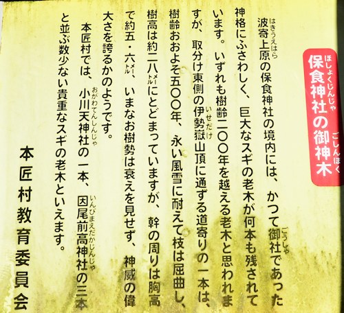 ![]() (4) 神社の杉の木の説明です。左の写真の鳥居の横の看板です。 |