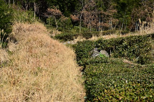 ![]() (6) 左折して直進すると右側にお茶畑があり、茶畑の脇に踏み跡があるのでこれを登っていきます。 |