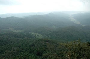 | 先週から台風の影響で天気も悪く、遠くに出かけるには二の足踏むような天気なので、近くの国東半島にある「小門山」に登りました。「大分百山」では「小門山」と書いて「おどむれ」と読むようになっています。 頂上には城があったようで、資料等を見ると大友宗鱗の時代のようです。現地に行ってみると「小門牟礼」、「雄渡牟礼」などの字がありどれが本当かよくわかりませんが、読みは「おどむれ」です。 登山口は最低二つありそうですが、今回は「成仏寺」そばの「小門牟礼城跡入口」から登りました。 天気が良いときに登れば、テレビ中継のアンテナが多いですが、頂上からの景色はかなり期待できそうです。 また、登山道は台風16号で落ちた杉の枝で覆われていましたが、よく見れば整備されています。 途中、立派な角を持った鹿にも出会いました。 (2004.9.5) |