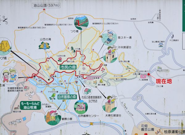 ![]() (1) 「現在地」に設置されていた看板。入口駐車場から出発して片江展望台まで歩きました。 |