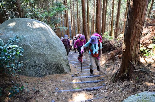 | 油山。福岡市内に住んでいた学生時代、どこからでも見えた福岡市の山で、新入生の頃、歓迎ハイキングで今の管理棟前だと思いますがゲームをしたり、自転車のトレーニングであそこの坂道を駆け上がっていたことが思い出されます。 そよかぜ姉さんから、「そろそろ油山企画を練らんね」の天の声に、皆さんにお声かけをしたところ、日程はあっという間に決まり心配なのは毎度恒例、hirokoさんと自分の組み合わせが「嵐を呼ぶ」ということですが、今回はそれを上回るパワーがあったようで風も無く穏やかな1日を過ごすことが出来ました。 事前にばあやんさまが市民の森情報を仕入れて頂いたところに寄ると、開門が9時!土日にしては遅すぎる感もあり、後で気が付けば路肩に停めて登っている方も多く見られたので、それでも良かったのかもしれませんが、ばあやんさまのセレブパワー交渉することなんとか20分早く開門して頂きました。 まずは、ゴールとなる片江展望台に車をデポしてから、ゲート近くの駐車場に車を止め出発です。一応、リーダーを仰せつかるも事前に準備しておいた地図は忘れ、はたまた直前に頂いた概略図も車に置きっぱなしと先行き不安な兆候です。それでも皆さんのご協力を得ながらルートを外すこと無く山頂を目指すことが出来ました。 登山道は市民の森というだけあり良く整備され階段も多く、少々ぎっくり腰気味の足には少し堪えました。登山道周辺の自然はというと杉林、雑木林の囲まれ、登山道も良く踏まれ個人的私感でいえば高速道路並みに広い道でした。福岡市近郊の山ということ、天気にも恵まれていたのでもっと多いのかな〜、と思いつつ思った程は多くなかった印象です。 それでも、30名近い団体さんを始め、結構な方々に間断無くすれ違うところは福岡市民の山なんですね。 山頂は「木に囲まれている」はずでしたが、なんと福岡市中心部方面は綺麗に伐採され、良いのかな〜、と思いながらも景色が見えることに関しては嬉しくもあり、短時間ではありましたがお湯を沸かしコーヒータイムと相成りました。 ここから先も、途中の展望台や大岩の上に登ったり、ポーズしたりと「○○は高いところが好き」、「××もおだてりゃ木に登る」等この手の表現がぴったりで、そりゃ誰じゃ、と聞かれると・・・ 最後に片江展望台に到着し、思ったより早く着いたのでなんとなくゆたーっとした気分で記念写真を何枚も撮りました。山の中でも話ながら、「次回、また集まろう」と言って、このメンバーで集まったのはなんと2007年6月以来だったので6年5ヶ月ぶり。それぞれではお会いしていたのですが、特に、ばあやんさまとは正味6年半ぶり。それでも、掲示板に書き込んで頂いたりメールのやりとりの中でお会いしていたせいか、とても身近に感じました。でも、やっぱり一緒に山に登らないと。 ということで、定期的な同窓会になりそうな今回の油山登山でした。 下山後は、皆さんでばあやんさまのお宅に上がり込み、ノンアルコールではありましたが、久々に集まる面々でばあやんさまが準備して頂いたおでん、おいなりさん、ロールケーキと最後まで笑いの絶えない一時を本当にありがとうございました。 (2013.10.8) |