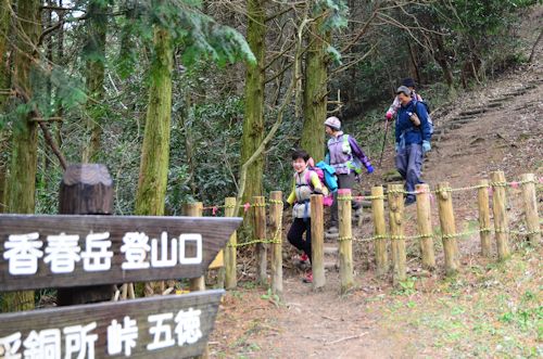 | 昨年の暮れ、懐かしい方々と会う機会として油山(福岡市)に登り、その時に、これからは定期的に会いたいね〜、とのこと。 それでは、とhirokoさんとそよかぜ姉さんが企画、香春岳、牛斬山に登ることになりました。香春岳は、毎度福岡市を往復する際に石灰の採石場として山の半分近くが無くなっている山を見かけ、どんな山だったんだろうと思うと同時に、その奥に二ノ岳、三ノ岳があり今回は三ノ岳に登りました。事前に山の紹介を読むと、岩場コースとファミリーコースがあり、岩場コースは危ないので素人は登らない方が良いと書かれていたので、ちょっと緊張です。 9時過ぎに五徳越峠付近の登山口に集合し、お初の方もいらっしゃったので挨拶してから出発です。出発の直前にhirokoパパから岩場コースなので危ないと思ったらロープを出して欲しい、とロープを渡され緊張の度合いが膨らみました。最初のうちは防火帯のような広い道を進むこと10分程でファミリーコースとの分岐点でこれを直進し岩場コースへ向かうと、真正面に壁のような岩がありここからほぼ山頂まで岩の連続です。 ルートの紹介やhirokoパパの心配とおり結構な岩場の連続で、普通なら途切れる場所がありそうですがひたすら岩と向かい合うことが出来ます。自分だけならスルー出来そうな場所でもばあやんさんを始め女性には厳しい場所もあり、グループで登る場合はロープを持参した方が良さそう、と考えるのは一度歩いた方なら分かると思います。岩には赤い→でマーキングされ、適度に足がかり手掛かりがあったので実際にロープをだしたのは一回だけでした。加えて、自分の母親と年齢がほぼ同じのばあやんさん、身が軽いというか健脚というか、ホイホイ登ってきます。厳しいところも「どうしようかしら〜」なんて口では言ってますが、体の動きは余裕です。 そのほかの皆さんも心配をよそに山頂まで標高差150mで連続する岩場を無事、通過することができました。 山頂は小広場になっていて見晴らしが良く、皆さんで記念撮影した後、ファミリーコースを下ります、というか、岩場コースを下るのはかなり大変。途中、林道を経て再び、杉林の中の登山道を元の道に戻ります。途中、鉱山の跡の紹介が書かれた「ズリネ間歩(まぶ)」があり、以前はここで銅が産出され歴史的に重要な鉱山だったようです。間もなく、元来た道に合流し登山口に戻りました。 ほぼ予定どおり12時過ぎに下山し、その後少し下った長光円陣桜公園に移動し、hirokoさんご夫妻主催の豪華昼食会です。 ご夫妻の車はカセットコンロ2台を駆使して即席のうどん屋台となり、そのほかにもサラダ、デザート、コーヒーを等々を準備して頂きました。しっかりガッツリ食べたせいか少し眠たくもありますが、1時間ほどのお持てなしを頂いた後、午後の部へ出発です(2014.3.9)。 牛斬山に続く→ |