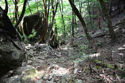 ![]() (7) 急登を見上げたところです。人が写っていないのでイマイチ雰囲気がわかりませんが結構な登りです。 |