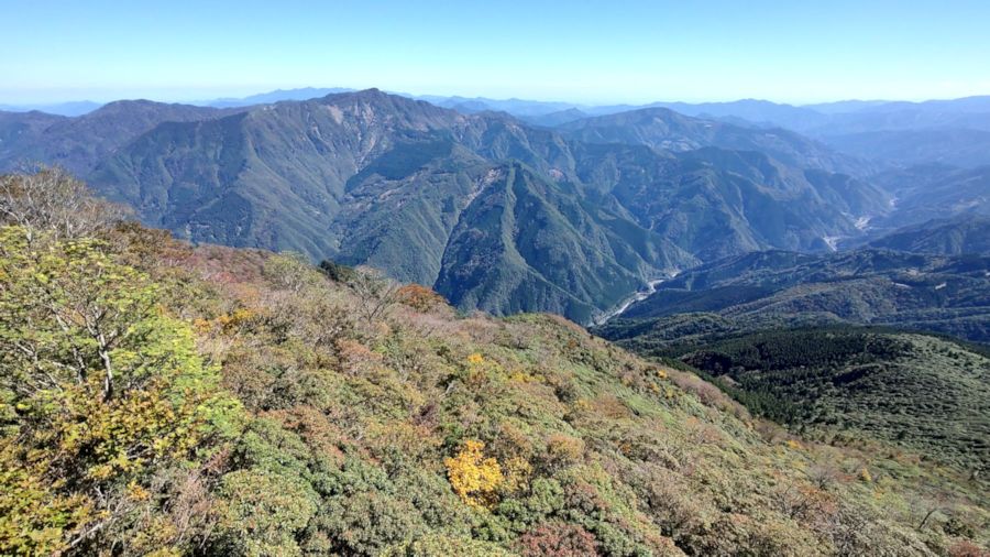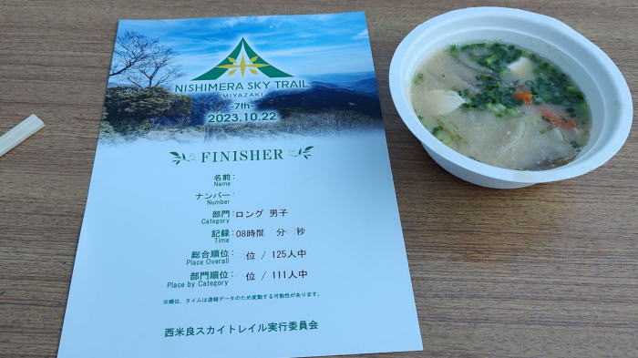 | トレイルをやってなければ、西米良村に足を運ぶ事なんて無かったと思う。 4年前に初めて参戦し村あげての行事として開催されている印象を受け、昨年10月に参戦予定でしたが気象災害で延期となり、今年10月、2回目の参戦です。 トレイルでは普通考えられない国道半分占めきりのスタートで、ゴールする時間帯までその状態で、参加人数がロングで200人に満たないけどとても贅沢なスタート&ゴール地点です。 国道区間は人口1,040人(R5)の「中心街」でもあり、住民のみなさんが「行ってらっしゃ〜い」、「お帰り〜」と出迎えてくれます。途中の道すがら集落の方も応援してくれたり、他の大会ではあまり見かけない光景です。 4年前の大会では熊本県側に宿泊しましたが、今回は西米良村に宿をとりました。会場に近い場所は、すでに満席状態だったので、会場まで30分ほどかかる場所に「おがわ作小屋村 桃源郷の宿」に泊まることにしました。 集落の中にある宿(昔の城跡)の環境はすこぶる良好で、自分が泊まった部屋は10畳、3〜4人寝泊まりできます。 素泊まりだと3,300円。周囲に店舗も何もないので食料、アルコールも持ち込み可。 それぞれの部屋には湯沸かし器、炊飯器、炊事場、調理必要な道具、茶碗、皿も備え付け。風呂、トイレがあり1DKタイプの造りです。食事付きで5,600円。ただ、若い方には普通に泊まる場合でも物足りない量かもしれないので、夜食、アルコールは準備しておいた方が無難です。 夕食は美味しかったし、トレイルが無ければ十分な量かと。ちなみに夕食は各部屋まで運んでくれて、翌日回収するシステムでした。 周辺には市房山、石堂山など山塊の懐なので、連泊して山に登るにはもってこいかな〜と、感じた良い宿でした。 宿の受付する時、「明日、早く宿を出るけど・・・」すると横にいた方も「自分もなんです。」 「トレイルですか?」「はい。バーティカルなんですが試走したら全然タイムが関門に間に合わなくて・・・」 ゴール後、再会できましたがやはり第2エイドでタイムオーバーしたそう。 今回も助手席にゆうたろうを同行。前日に受付を済ませたので、のんびりモードで小学校の駐車場でゆうたろうと話しながら準備です。携帯用の写真も同行、スタート、ゴール後と山頂で記念写真でした。ゴール後に嫁さんと自撮りしてると運営主催のUFの高木代表が気付いて撮影してくれました。 YAMAPつながりのひろみんさんが参戦すると聞いていたので開会式で見渡すとそれらしい方を発見。スタートしてしばらくは後ろ姿を追いかけてましたが抜くときに「ひろみんさん!」「おっ?」「よっちゃんっす」「お〜」 4年前に経験してるはずだけどなかなか市房山登山口のASに着かない・・・そろそろかな〜 GPSの距離をみるとそろそろなんだけど。まだ着かね〜 気ばかり焦ってようやくASに着くとここから市房への本気の登り。ここまでも結構なアップダウンで足が無くなってるのに・・・ASで普通にジャケット着て立ってるおじさん、さっき開会式で見た村長のようだけど。 「ひょっとして村長さん?」「はい、村長の黒木です」 天気が良いとはいえエイドにまで足を運ぶとは、その後、ゴールでも出迎えて頂きました。 エイドもシンプルですが充実し、やはりコーラは嬉しい。 特筆は「にぼし」といっても魚ではなくて干した芋をベースに小豆、栗、もち米を混ぜて蒸した郷土料理で農作業の際のおやつだったそう。 ラップで小分けして食すとおはぎに栗を入れて混ぜ合わせた感じで、余分に頂いたのは帰りのおやつにさせて頂きました。 ここからひーこらタイムだけど、山頂でリタイアしたい気分。4年前より明らかに登る速度が落ちていて、思いのほか足にダメージが。 山頂に着くと360℃の絶景で、前回も天気良かったけど、さらに透明度が高く遠くの山まで綺麗に見えます。足下には人吉盆地が箱庭のよう。でも、足が攣りかけてる、いや攣ってる。 ここで人生初のツムラ68番を投入! 数年前に購入したけど良く分からんけど効果はあったかも〜 後は下るだけ〜 だけではない。断面図を見ると尾根がのこぎり状。小さく見えるけど実際はやはりしんどい・・・下りながら感じたのは下るスピードも落ちてる。 長〜い林道を前の方の背中を見ながら足を動かす。ようやく残り4kmのエイド。ここから最後の登りなんだけど、いつも思うのは最後は国道の歩道を走らせて欲しい。 ここからゴールまで、明らかに前回より動きが鈍い。ゴールの関門は17時。 16時は過ぎるけど余裕があるかなぁ、と思ってたら結構ギリで16時半の到着でした。毎度のことながらゴール手前でスマホで写真を撮ってからのゴール! もう少し早いかなぁ、と思ってたけどとりあえず時間内にゴールできたので良しとしよう。とは言いながら前回より遅くなった要因は何か前回の時とデータを比較する必要を感じてます。 ホントに最後の登りが終わった辺りの分岐点で誘導していた女性が、「ここから概ね下りです