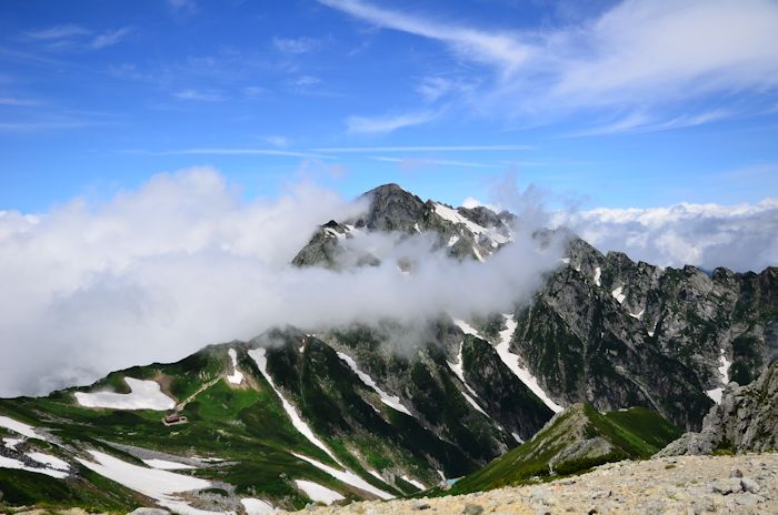 | 【序章】 遠征シーズンの到来となり当初、7月下旬に実行するはずでしたが、梅雨明けもままならない北陸地方。どうやら8月上旬に梅雨明けしそうな様子だったので、仕事のスケジュールを半ば無視して職場の皆さんには「山行きまーす」のノリで相変わらずの脳天気です。 本来であればタイトルは「立山〜劔岳」の予定でしたが、初日の天場である剱沢キャンプ場に着いてテントを張った頃から頭痛と吐き気で、そのままテントに倒れ込んでしまいました。荷物が重いとはいえ昨年と同じ程度で、登った標高は去年の2/3程度のはず。昨日買ったクリームパンが当たったのか、高山病?でも昨年は大丈夫だったし・・・よくよく1週間単位で思い起こすに週の前半軽い熱中症状態であったことが尾を引いていたのかもしれません。 食べ物は勿論のこと水分も受け付けない状態でこうなれば寝るに限ると決め込み、ずーっと寝ているとなんだかテントを叩く雨の音が・・・昨晩は綺麗に目の前に劔岳が見えていたのに。目の前の視界は数十m。これは登るなとの天の声と思い、雨が止むのを待ち撤収しさっさと室堂に下山しました。 【立山駅】 大分から高速を経由、北陸道立山ICで下車、密かな楽しみにしている地元のスーパーに立ち寄り、今晩の夕食(弁当)を買い込み立山駅に着いたのが17時45分頃。距離で1,005km、休憩等込みで13時間でした。 今回は室堂へ向かうため立山駅周辺の駐車場で車中泊することにしました。駐車場は満杯状態でしたがなんとか駅に一番近い所に停め明日の偵察も含め立山駅に向かいました。 すでに切符売り場は閉まっており、翌朝は5時20分からの販売で、予約しておかないと早い便には乗れないとのことでした。ちなみに駐車料金は無料で、路肩にもびっちり停めている車も多いのですが、そこは厳しくなさそうでした。 翌朝、5時過ぎ駅前に行くと切符売り場にはすでに50名程度の方が並んでいました。立山駅から美女平を経由して室堂まで2,360円(往復だと4,190円)で荷物が10kg越えると300円別途徴収されます。それにしても明け方には雨が降り、立山駅から見上げるとガスに覆われちとテンションが下がる空模様です。 【室堂へ】 ケーブルカーに乗り込み美女平でバスに乗り換える際に荷物代300円を徴収されますが、その荷物を計量するための秤があり合宿らしいグループの男子が荷物を図ると28kg、するとかなり重そうにザックを持った女子部員が計ると30kg!、顧問の先生が「何そんな入れてきた?」、女性部員「キャベツです!」 いや〜、若いとは良いね〜 バスに揺られること50分、途中の見所も丁寧に説明をいただきながら室堂に着く頃には青い空が見え始め、この後我が身に襲いかかる熱中症(多分)も知らず今日から始まる山旅に大きく胸を膨らませていざ出発です。 【立山】 ターミナルには夏の野外教室らしい小学生の集団が先生から今から登る際の注意点等を体育座りで真剣な表情で聞いているのを横目で見ながら、この集団に巻き込まれないようにと、歩き始めました。 昨年とは違い、いきなり2,400mなのですぐに雪渓を何度か歩くと、金を払って登っただけあるなぁ、と。 さて、雄山方面を見上げるとすでに早朝から登っている方々の姿を多く見られ、一の越山荘付近から見上げるとまさに長蛇の列が山頂に向かって伸びており、今回はなかば諦め蛇に巻き込まれてみました。一方で反対側を振り向くと槍が岳が見えたりと景色は良く多くの方々がここで一服していました。 日頃が静かな山しか歩かないこともあり、どうしても横道があればそちらに逃げ込み少しでも先に、と思っても、すぐに巻き込まれてしまいます。振り返ると視界を遮る木々が無いので九州と違った高度感を感じます。 ようやく山頂に着くと社務所があり山頂手前にはお祓いを受けるために、ここにも列が出来ておりこの列を横切るように最高点である大汝山へ向かいました。ここから先は、山雑誌等で読んだとおり一気に登山客が減りますが、少ないとまでは言えない程度の方々が往来していました。 大汝山は岩のピークでやっと1〜2人程度が記念撮影出来る程度で順番待ちも発生。とりあえず横から手を伸ばしてタッチして次のピークへ移動です。大汝山のすぐそばに休憩所があり食事ができるそうです。 次の富士ノ折立は山頂付近が岩場になっていて、少し足下が不安定なピークでした。 たまたま近くにいた女性の足下が怪しかったので「大丈夫ですか〜」から始まり結局、途中までご一緒することになりました。関東から来られたそうで本来はランナー、マラソンは3時間そこそこで走り、富士登山競走も完走した強者とのこと。だから歩くのを見ているととにかく早いし足が軽い。ただ、岩場が苦手なようで、今年になって山に目覚めた姪と同じで、つい思い出し笑いしてしまいました。最近山に登り始め、これまでに登った山は富士山と筑波山とのことでした。 別山に着くと足下には雪渓と剱沢キャンプ場と目の前