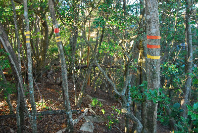 ![]() (9) 杉林を登ります。ピンクと赤のテープがありますが、赤が正解のようです。 |