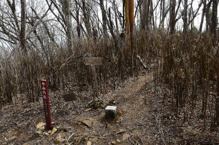 ![]() (21) 山頂から少し下った場所にカマボコ板大の看板があります。また北東方面にも明瞭な踏み跡があり、このルートも今後の宿題です。 |
