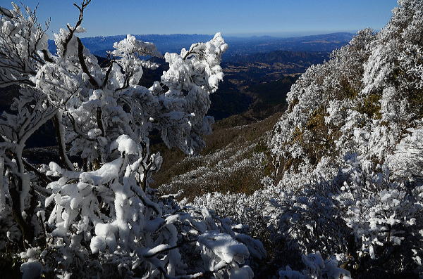![]() (3)展望台から祖母山方面。 こちらから見ると樹氷は部分的です。 |