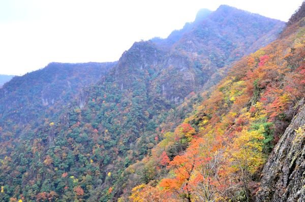 | 今年こそはくじゅう以外の山域というか祖母山系の紅葉を眺めてみたいと思いつつ、結局、皆様のHPやブログを拝見しているうちに大船山周辺の紅葉を外すことが出来ず、ようやく祖母山系に足が向きました。昨年の記録を見ると10月20〜21日に祖母山系を歩き、標高の高い場所ではほとんど落葉していましたが、今年は紅葉の進み具合が遅いので、思った以上に残っていたように感じました。ただ、昨日までの雨でかなり落葉したようです。 今回のイメージはまずは尾平から古祖母山に登り、朝日に照らされるはずの障子岳などの裾野を撮影、障子岳からは宮崎県側を撮影、あとはあちこちで綺麗な紅葉を眺められたら良いな〜、と。 さて、今回気になったことが昨日までの雨による川の増水です。特に、県南では過去最高の雨量とかで黒金尾根を下った場合、川の徒渉が厳しいかも〜、でも、釣りで川の中を歩いていたことを思い起こせば、靴が濡れる覚悟で渡ればなんちゃなかろう、と思いながらも祖母山経由で宮原から下れば大したこと無かろう、と臨機応変に対応することにし結局、12時頃までに祖母山に着きそうだったので、勢い祖母山まで歩きました。 天気予報は晴れマーク、一応、冷たい強風は予定していたので稜線の強風もそれなりで準備万端とはいえ、やっぱ寒さに慣れていない体には厳しいものがありました。古祖母山山頂近くの展望台でしばしガスが晴れるのを待ち、時折、陽がさしますがスッキリ、とまではいきません。諦めて山頂側から紅葉を覗きましたが、すでに終わった感じで寂しささえ感じたので、休むこと無く障子岳へ。障子岳ではちょうど北谷と四季見が原方面から登ってこられた方とお話を。やっぱ、盛期は少し過ぎたこと、思った程天気が良くなかったこと、祖母山が見えないこと等を話して自分は祖母山方面に移動しました。 実は、この時までは黒金尾根を下る気分が7割程度でした。実は尾平越から自分より先行している数名に気が付いていましたが写真を撮ったり、地雷を埋めたりしていたため中々追いつきません。ようやく、ミヤマキリシマ公園(小ピーク)で追いつき、話をすると、今日はここまでで尾平越のピストンとのこと。やはりここでも祖母山見えないし・・・と話をしながら自分の頭の中では祖母山まであと標高差で300m程度。ならば歩くか〜、と黒金尾根分岐も写真を数枚撮影しただけで休むことなく祖母山へ足を進めました。 山頂は誰もいません。12時ちょい過ぎだったので賑わっているかな〜と思いつつ、景色がほとんど見えない山頂でお湯を沸かし簡単な昼食です。しばらくすると、3名、1名、10数名と山頂に到着。一瞬ですが障子岳方面が晴れた他はずーっとガスが覆っていました。13時まで待ちましたがガスも晴れず、宮原方面に向かって下山開始です。 こちらの方は、尾平越〜障子岳の区間より紅葉を楽しめる頻度が高く、ついついシャッタータイムで立ち止まってしまいます。願わくば青空が欲しかったところですが、これも贅沢と諦め紅(黄)葉を楽しみながら下山しました。 心配した川も少し靴の中が湿った程度で無事下山終了です。 |