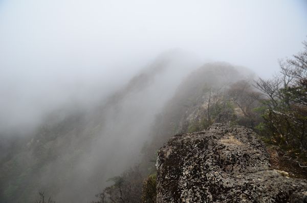 ![]() (5)着いて間もない頃はこんな感じ。 ![]() (6)山頂の南側はガスがうねり晴れ間も見え始めました。 |