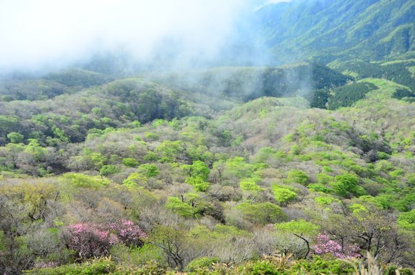 ![]() (19)障子岳山頂。足元から古祖母山方面にもう少しアケボノツツジが頑張っています ![]() (20)障子岩山頂付近、古祖母山寄り。 |