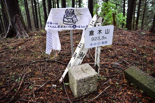 ![]() (20)地図「11.倉木山」 周囲は杉に囲まれた山頂です。 久々におんせん県豆絞り登場! |