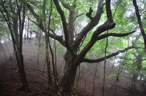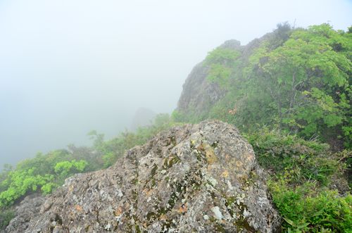 | 【長い前置き】 祖母傾山系の地図を眺めると、幾つかルートが見えてきます。その内の一つは先日レポした白水から前障子に至るルート。一番は、烏嶽から倉木山を経て、前障子岩に至るルートです。 気になっていた前障子岩への取り付きは、前回クリアしたので、後は、このロングルートを歩くのみです。 でも、地図を見る度に躊躇する距離の長さで、前回、白水から登るルートの途中で眺めた、長〜い尾根を確認し、益々腰が重くなるばかりです。 ご存知(でないかも知れない・・・)のとおり、ルートを紹介する際は、原則ピストンすることにしています。前回のように別ルート(または逃げ場)があると、根性無しとしては、ついつい一方通行になります。 今回のルートは、倉木山で大規模林道へ逃げることも可能ですが、倉木山まで来れば、ピストンするしかないし、単独行の場合、逃げ道がありません。 「日が長くなったら歩こう」と、思っていたら、もうすぐ6月。日は長くなり、ついでに暑くなりました。世間は、良くも悪くもミヤマキリシマで賑わっている昨今、1,000m以下の区間が長いので、少しでも早い時間から登らないと、辛い時間が長くなり、歩くなら今! と決めた日。 雨は朝の内に止み、9時過ぎには陽が差す天気予報を期待するも、登っている間はずーっと霧雨とガス。しかも、木を掴むと一気に超局地的土砂降りです。 後になって考えると、ずーっと先の景色が見えていたら諦めたかも・・・。下山途中で、回復する天気の向こうに見えた前障子の坊主頭を確認して感じたところです。 途中の休憩時間を入れ、約12時間近く掛かりました。雨で足が滑りやすく、慎重歩いたせいか、でも、普通でもこの位かもしれません。長い休憩時間は、前障子岩山頂と下山途中、お湯を沸かした時で、それでも20分で切り上げての行動時間です。 烏嶽までは過去のレポ(2009年6月)もありますが、烏嶽までで大きく変わったのは、最初のスギ林の中は作業道が開削されていました。また、当時駐車したスペースも草が茂り、500m程下った所に神社があったの、ここに停めさせて頂きました。 5時過ぎ、準備していると地元の方が神社に乗り付け、 「今から、何処に行くんかえ〜」、「そこの烏嶽に登ります。」 登山口から少し離れているので、一瞬「?」、すぐさま「どこから来たんかえ〜」 「県北からです〜」、「へぇ〜 (物好きやな〜)」 「車を停めちょって良いすか〜?」、「良いで〜」みたいな会話の後、 「鍵をちゃんと掛けたかえ?」、「はーい、ありがとうございまーす」 m(_ _)m 【本題】 烏嶽から先。 至る所で岩場が現れ、何処をどうルートを取るかは各自の判断になります。途中、テラスのような展望台もあったりして、天気が良いと、ついついのんびりして先に進めなかったかもしれません。途中、フィックスロープで迂回する岩場もあり、特に、雨で滑りやすかったので慎重に通過しました。 乾いている時は、グリップが効きそうな岩で、下山するときは登りほど難儀しませんでした。 岩場と新緑を途中の三角点(4等、点名:宮尾)まで楽しむと、ここから先、倉木山までは普通の杉林です。 途中から尾根に沿って作業道が造られ、登るときは杉林の中を尾根の中を歩きましたが、下山時は途中まで作業道を利用しました。この作業道の終点から倉木山の最後の急登です。目印らしいテープもありますが、特に定まったルートも無いようなので、山頂まで適当に歩くと杉林の中のフラットな山頂に到着です。 ここから、ちょっと歩くと自然林に変わり、倉木山の少し先、岩場を下る箇所があり、ルート取りが分かり難い岩場でしたが、ここを除くと厳しい岩場は、ほとんど無く、ガスに煙る新緑を眺めながらの登りになります。結構好きな尾根道です。 途中からブナやナラ等(これしか知らない(^^;))に変わり、足下は、すでに枯れてしまったスズタケで、歩くとパキパキ折れる音がします。ここまで来ると間もなく、白水ルートとの合流点で二股になった赤松が目印になります。 ここから、先は前回の白水ルートのレポのとおりですが、少し修正があります。 前障子岩の山頂直下の△窓の岩は、通過せず、この手前から草木に掴まり山頂に登っていくのが、一応、本来のルートのようです。 さて、山頂直下を含め、このルートを引き返すことを想像すると、気が重くなります。 山頂に着いて、先端に行ってもガスは晴れず長居は無用と、いよいよ下山開始。想像していたほど手こずる事も無く、障子岩山頂を下り、本日のルートを黙々と折り返し歩きます。 注意点として、前回は別ルートを下ったので間違いやすいコースとは分かりませんでしたが、踏み跡が弱く、景色も似ているので覚えているだけで、4回コースアウトしました。恥ずかしながら、地図にも「×」で示した通りです。先人が巻いたテーピングの目印に加え、要所に赤テープを巻きましたが、それでも見落としてしまいました。出来ればGPSを持参