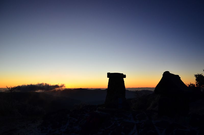 | 26日は思いも寄らない派手なパンク(詳細は掲示板に掲載)で年末の貴重な山行日数を減らしてしまいました。翌日の山行も思案しましたが我が家の恒例行事「もちつき」のため、本日、リベンジ山行です。 正直、同じ道路、同じルートで登ることに対してトラウマを感じつつも、ここは乗り越えなければ! と前回とほぼ同じ時間、同じルートでいざ〜 と、思いながら高速を走っていると、なんか微妙に車が揺れるし、この感覚先週と似てる・・・ 覚えがある。以前、パンクしたタイヤを右後ろに履いたまま。いつものコンビニの駐車場で確認すると、お〜、タイヤの空気減ってるし! これまでも空気を入れれば、しばらくは大丈夫だったので、タイヤ圧を確保してレッツゴー! いやはや我ながら脳天気。それより、先日あと数分で駐車場の地点で「ガッツン」いった路面をクリアして、残る道路もいつになく慎重に運転し無事、駐車場に到着です。しか〜し、さっき空気を入れたはずのタイヤは、さっきと同じくらい減ってる・・・(-_-;) 下山してから考えよ。 今年の最終日。あまり気合い入れずに登ろ、と、適当に短い休憩を入れながら登ると、国観峠までは自分では頑張ってるつもりの時間とあまり変わらんし・・・やっぱ、頑張ると後半バテるんですね〜 国観峠で上空を見上げると、ヒュー、と雲が流れ、月光に照らされる樹々がキラキラ輝いているようにも見えます。 足元は霜柱が立ちガリガリのボリボリで、下山する時も溶けていませんでした。 山頂には6時前に着くも、雲に覆われ今ひとつ空模様。6時を回ると次第に、上が見えてきたので三脚を立ていざ撮影! 期待した様な絵柄には至りませんでしたが、今回も撃沈することなくご来光を頂くことができました。有り難や〜 前回は、「山頂でコンビニスイーツを食べよう!」 のお勝手企画の予定が、帰宅後の残念企画となったので、これもリベンジ。登っている間はすっかり忘れて、そーいえば、ザック横に倒したし(^^;) と、恐る恐る取り出してみると、ほぼ無傷! しかし、本日はペットボトルの中身が久々凍る寒さだったので、外側が冷たい! 辛うじて凍らなかったことが唯一の救いでした。でも、山で食べると美味し〜 雪はほとんど無く、樹氷もちょぼっとの祖母山頂周辺。人出もすれ違った方を含め3名。押し迫った年の瀬山行でした。 今年は雨天が多かったに加え、我が家の行事が続き由布岳、祖母山、鶴見岳時々他の山、といった感じで、珍しくお泊まり山行は無しの年でした。 今年一年、同行できた方、し損なった方、山でばったり出会った方、掲示板やメールでお便り頂いた方、当HPをご笑覧頂いている皆様、今年一年のご愛顧ありがとうございました。この場を借りて御礼申し上げます。 来年も良い山日和を迎えられること、健康で過ごされますよう、ご祈念申し上げます。 よっちゃん |